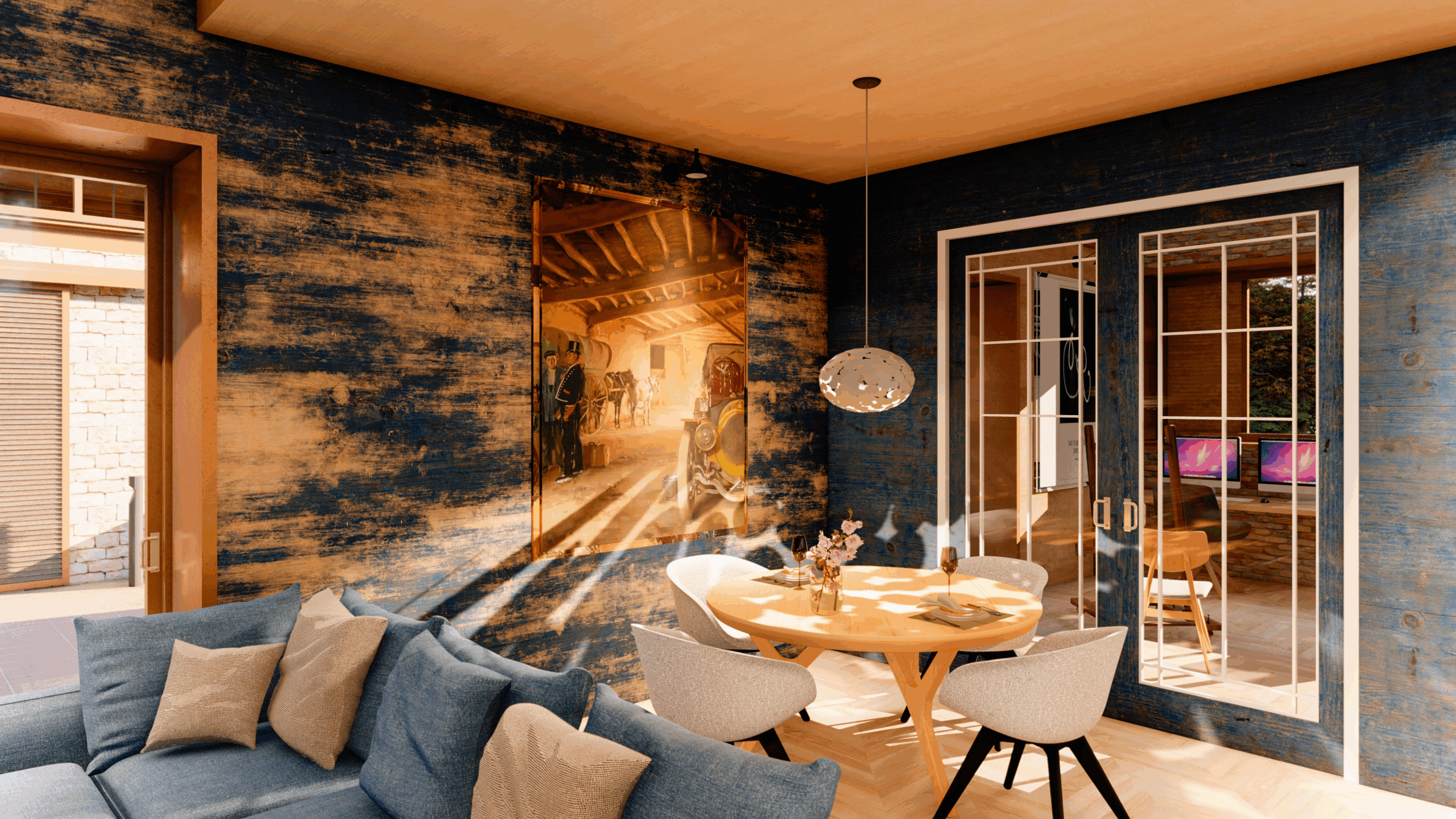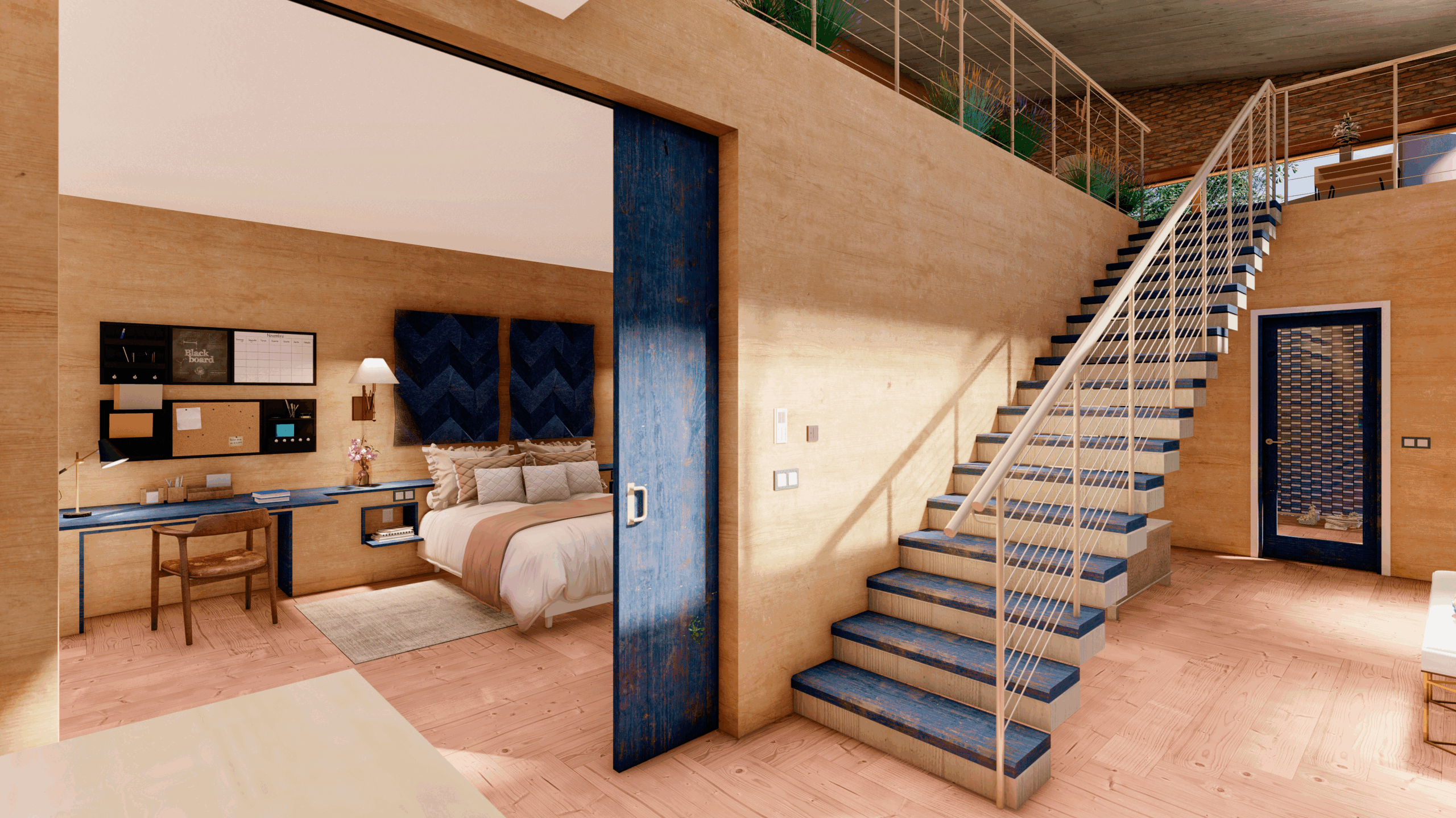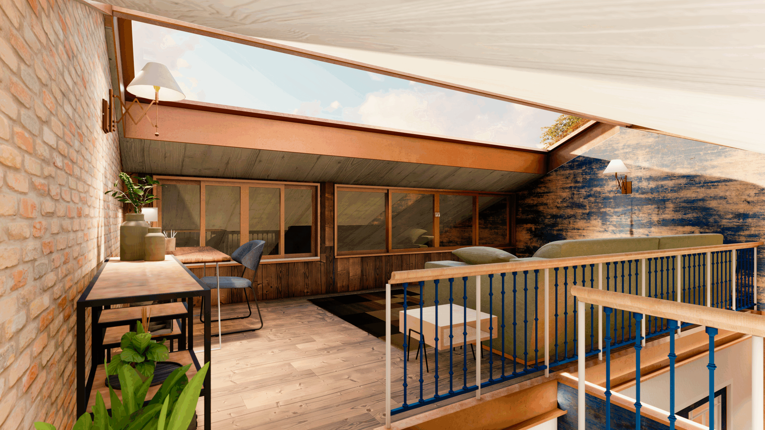 Des de l’altell de l’espai creatiu es pot observar la part inferior del saló i comunicar-se. Les diferents portes corredisses permeten la creació d’espais tancats sí necessari.