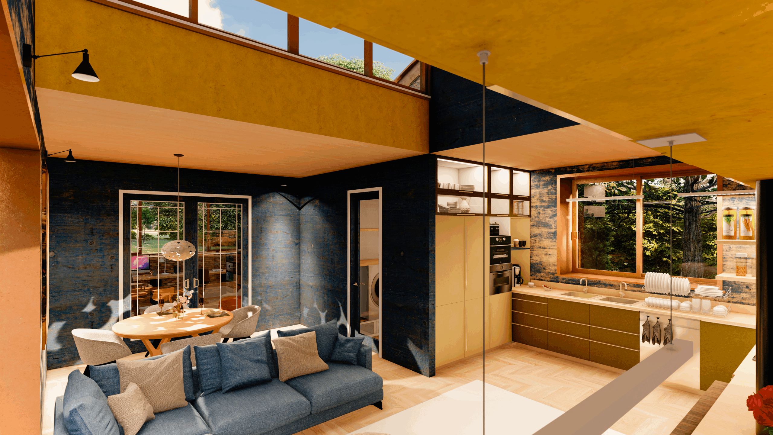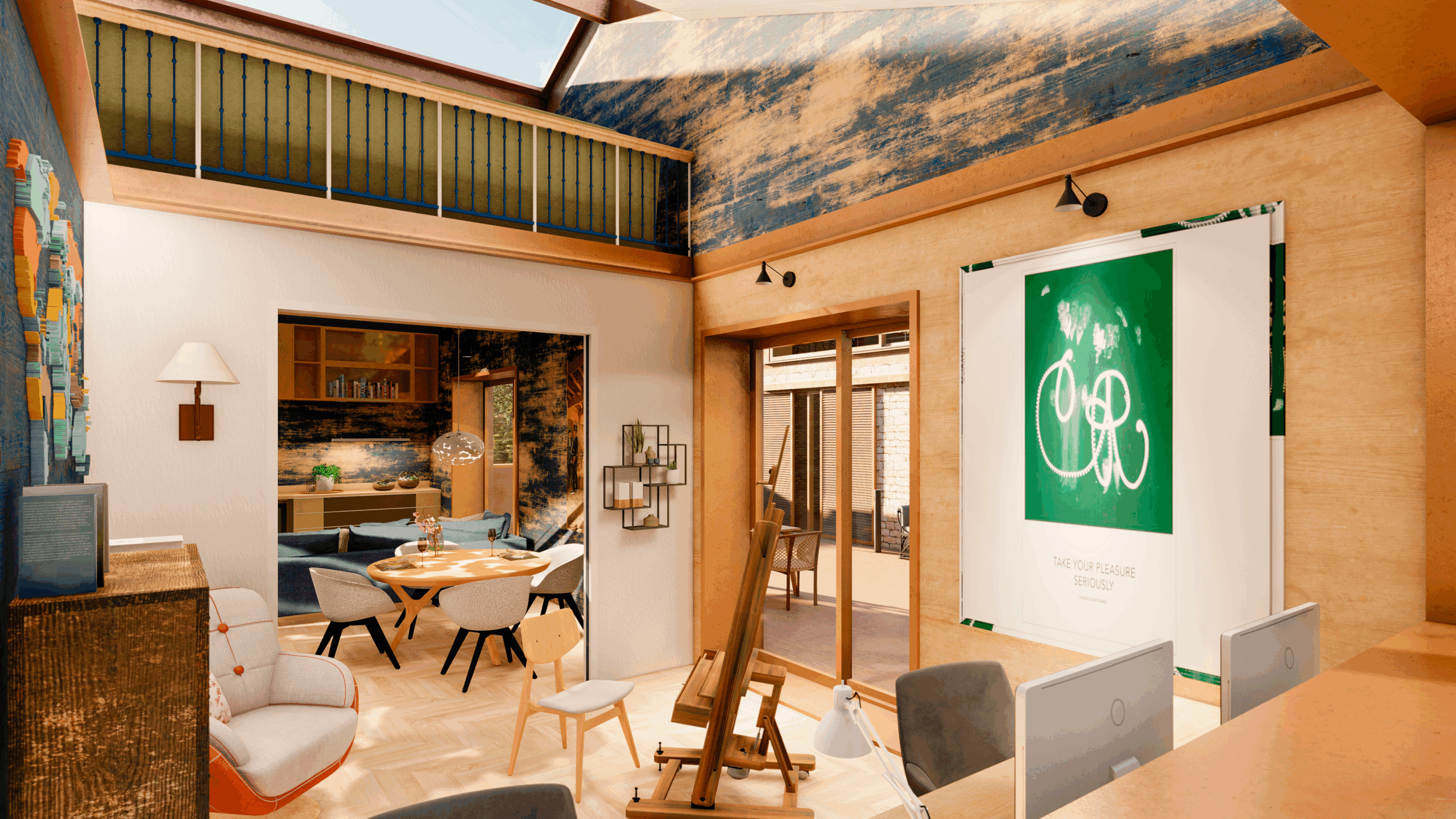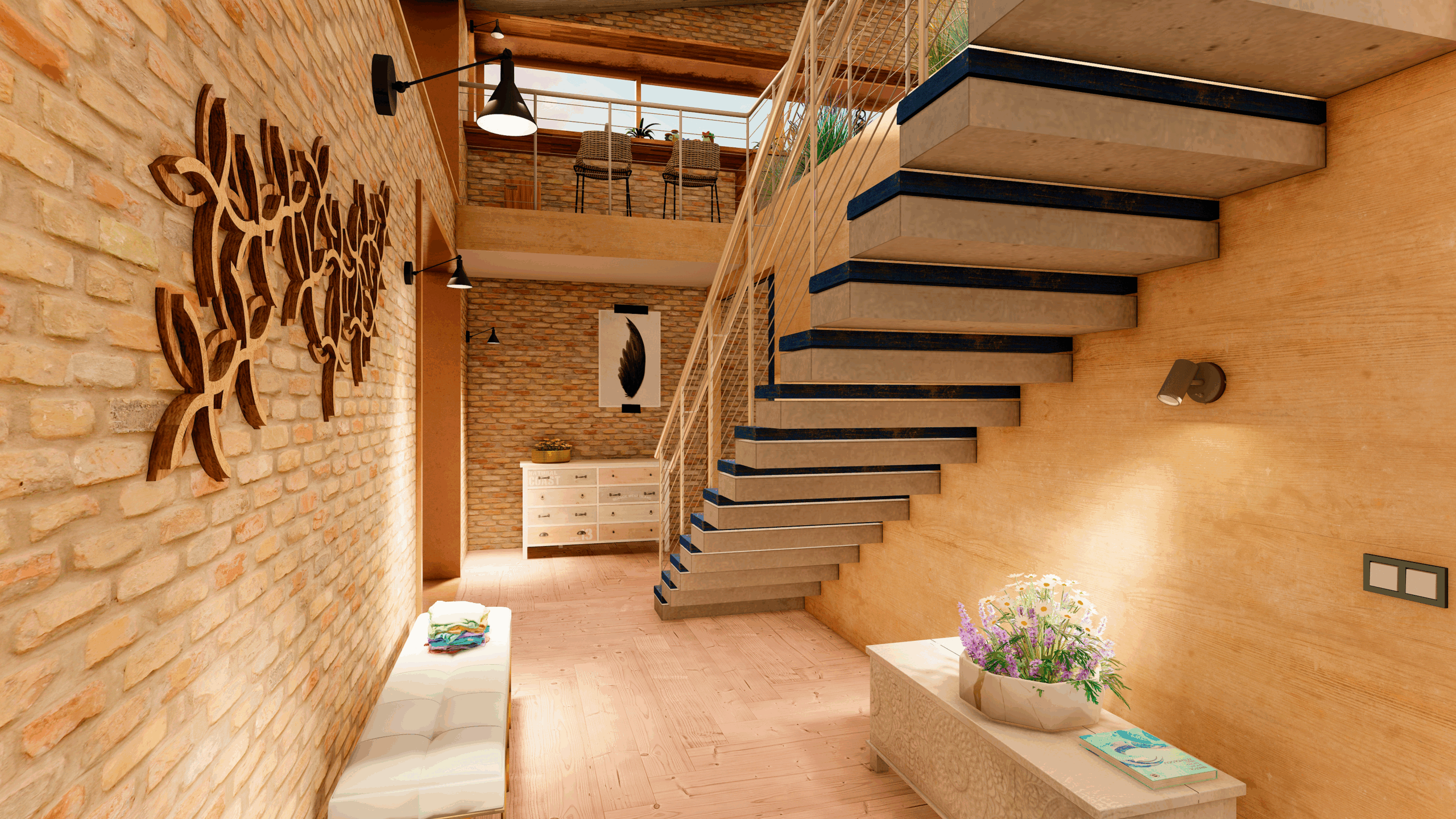 L’espai de dia es diferencia entre l’espai creatiu amb una altell de repòs i l’espai de cuina-safareig – saló i estar.
