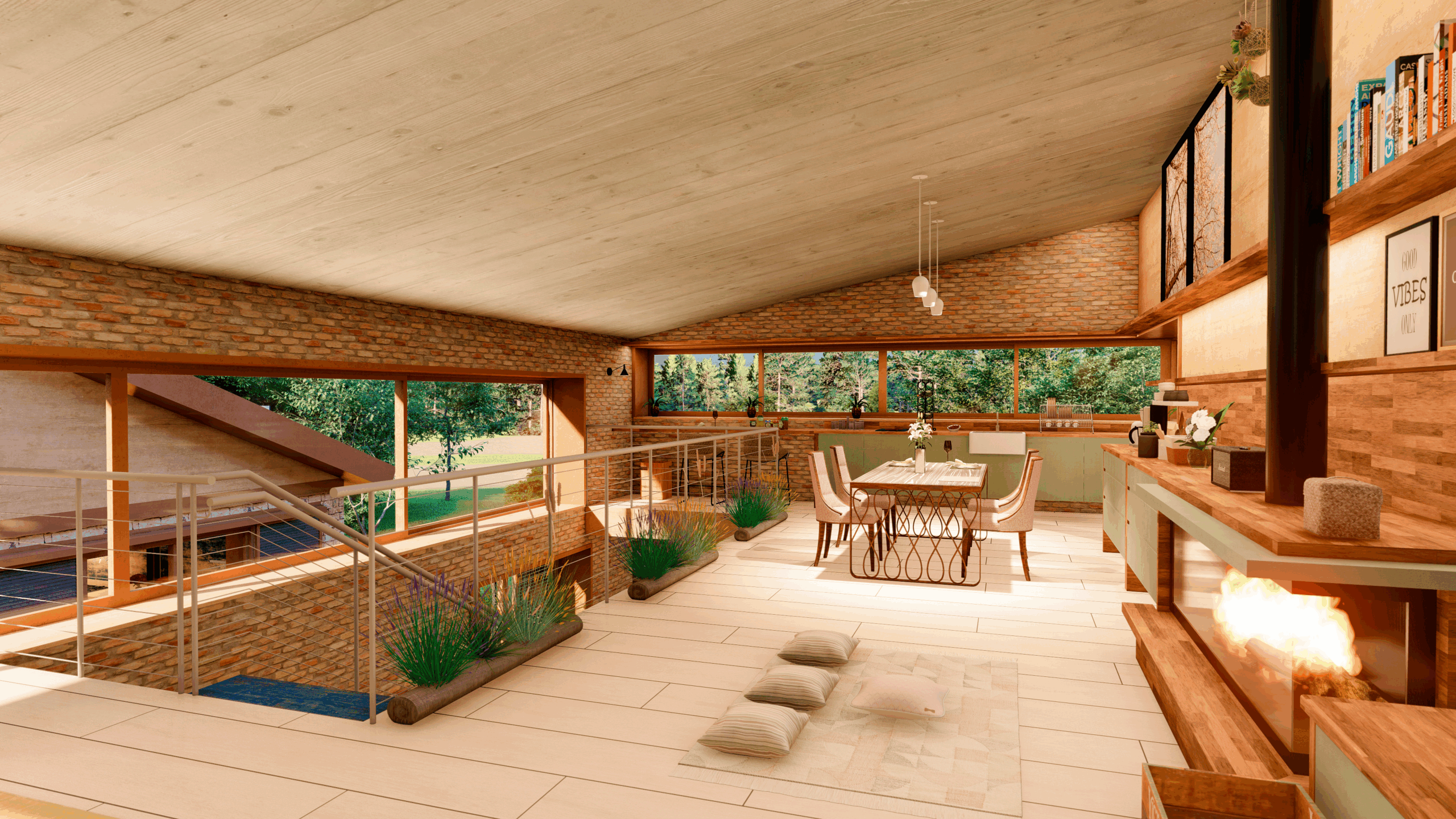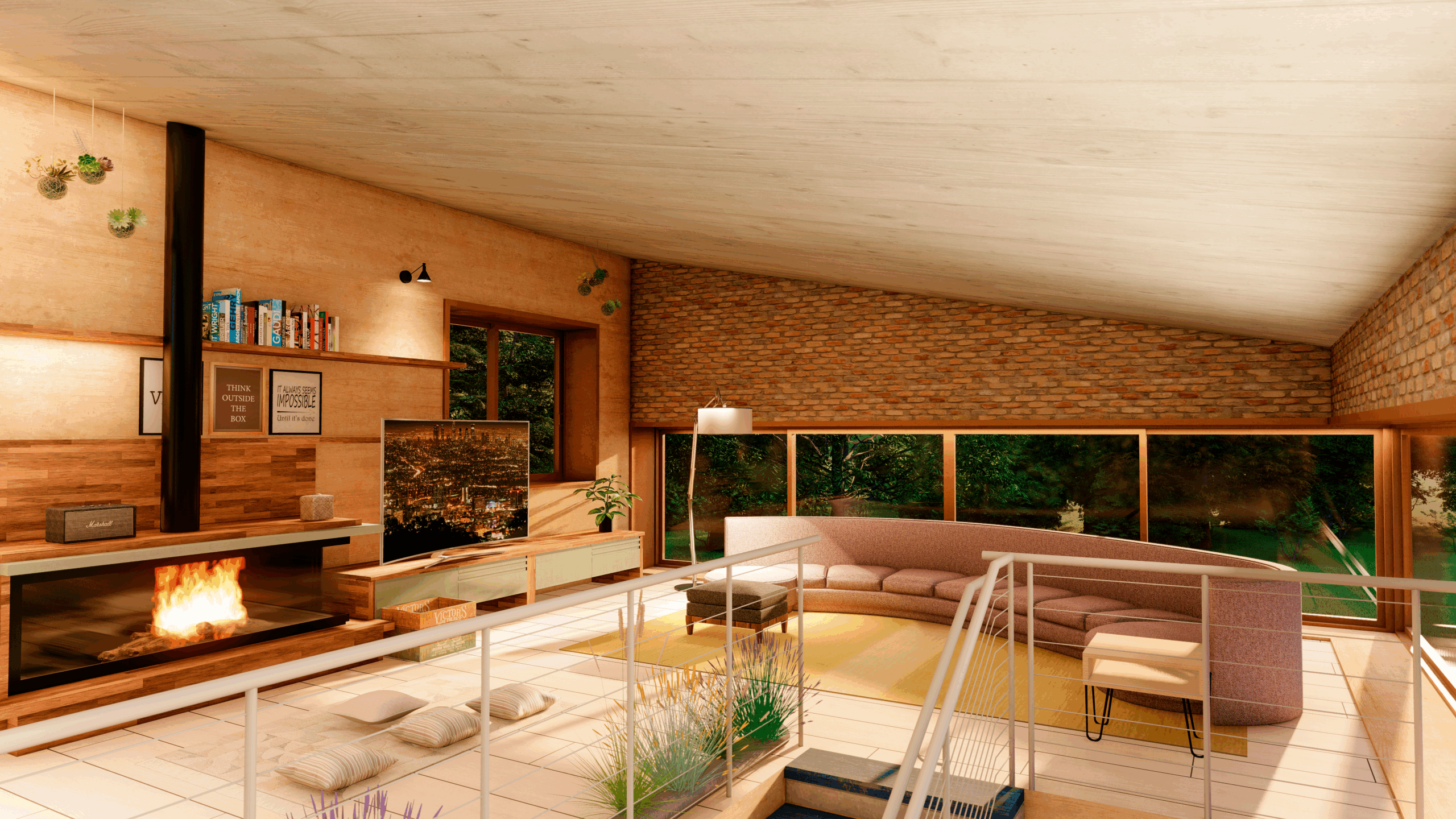 En aquesta planta s’hi ha dissenyat un altre saló amb llar de foc, cuina oberta i sala d’estar. És com si es volgués tenir un segon espai, més privatiu que en el volum de la zona de dia.