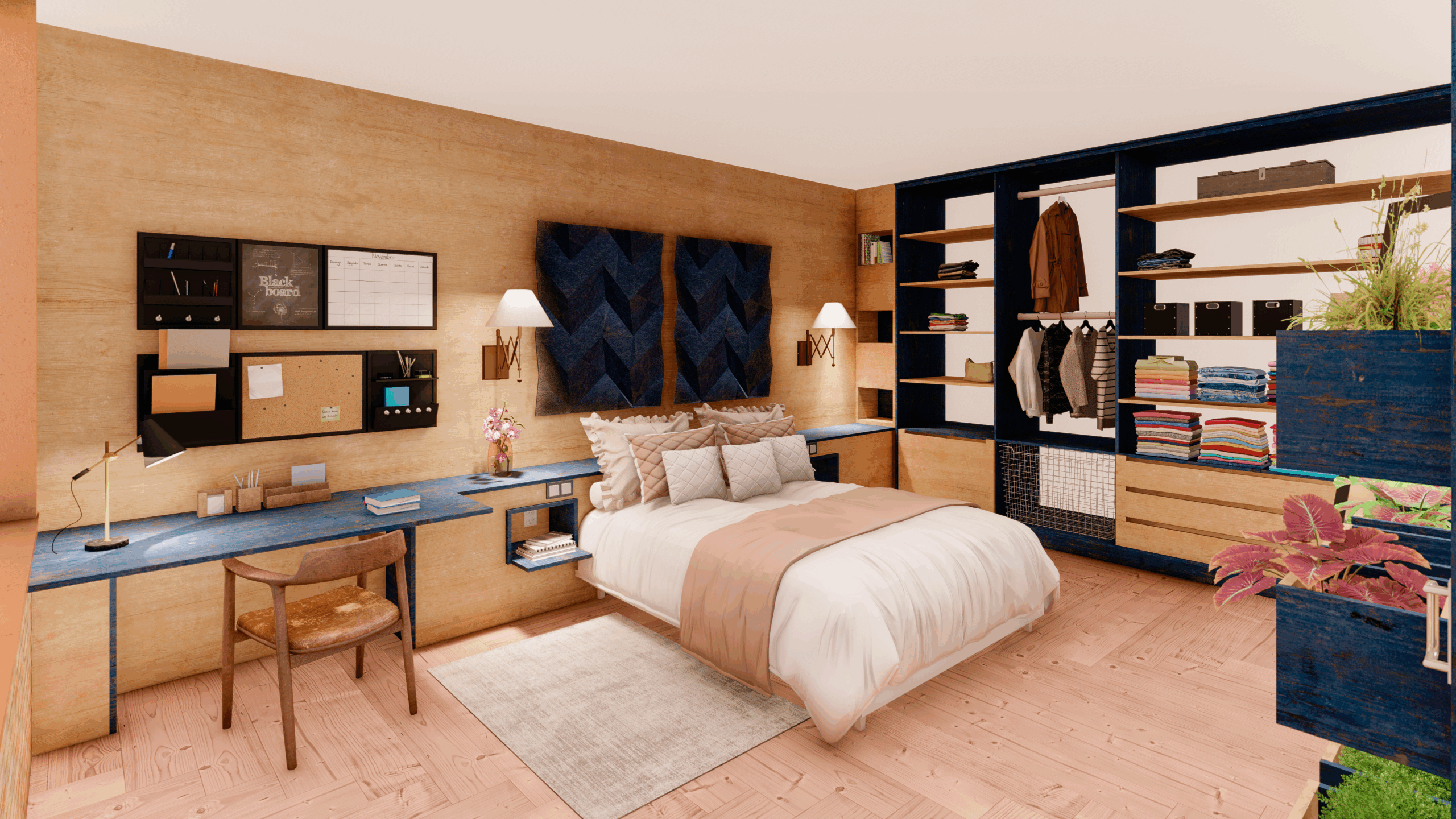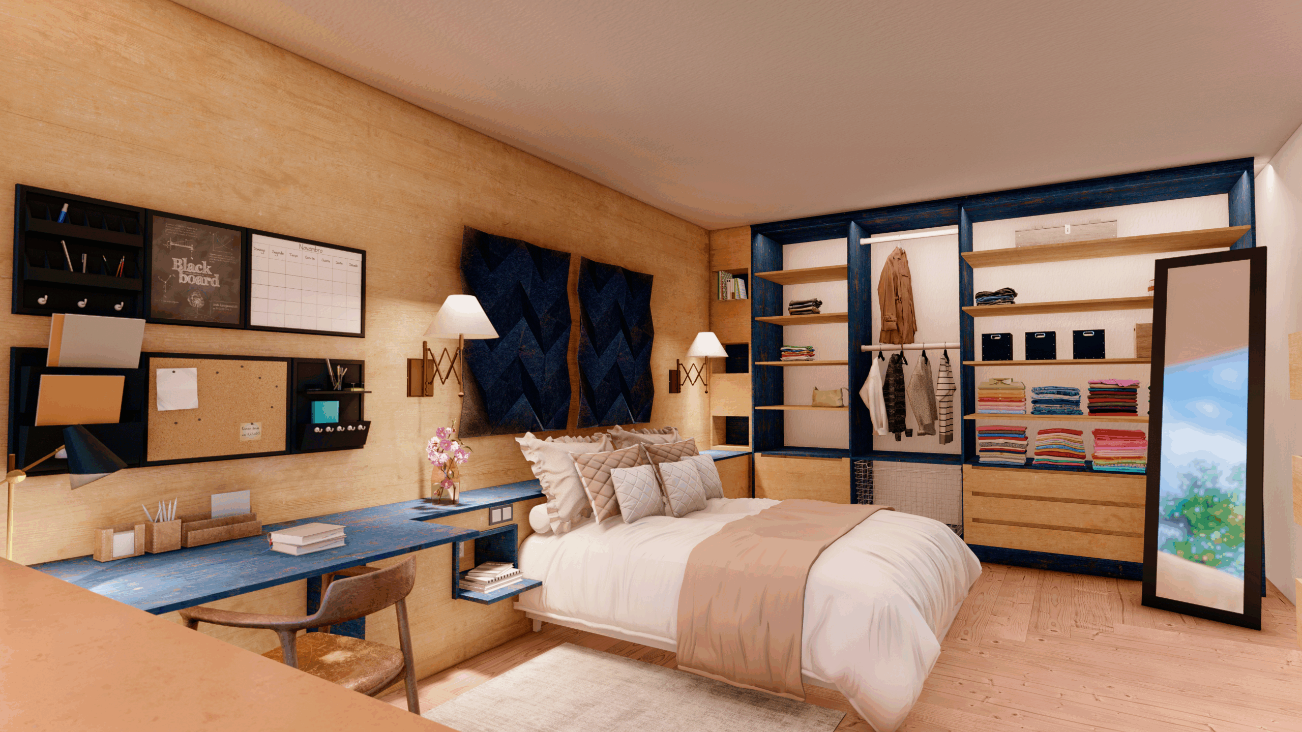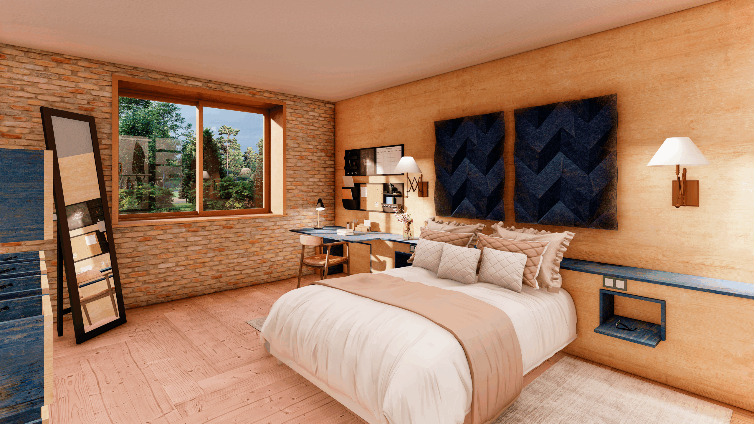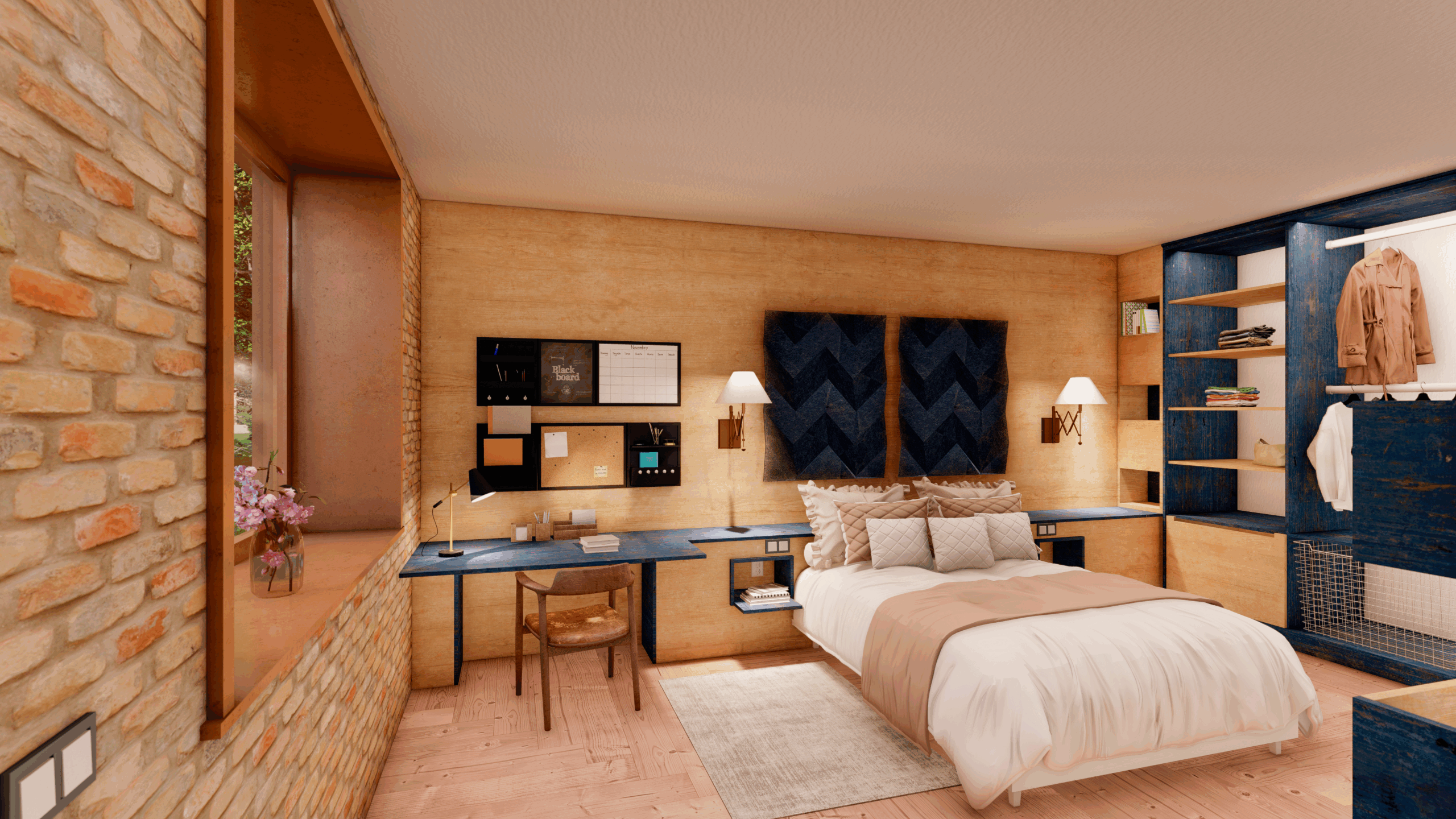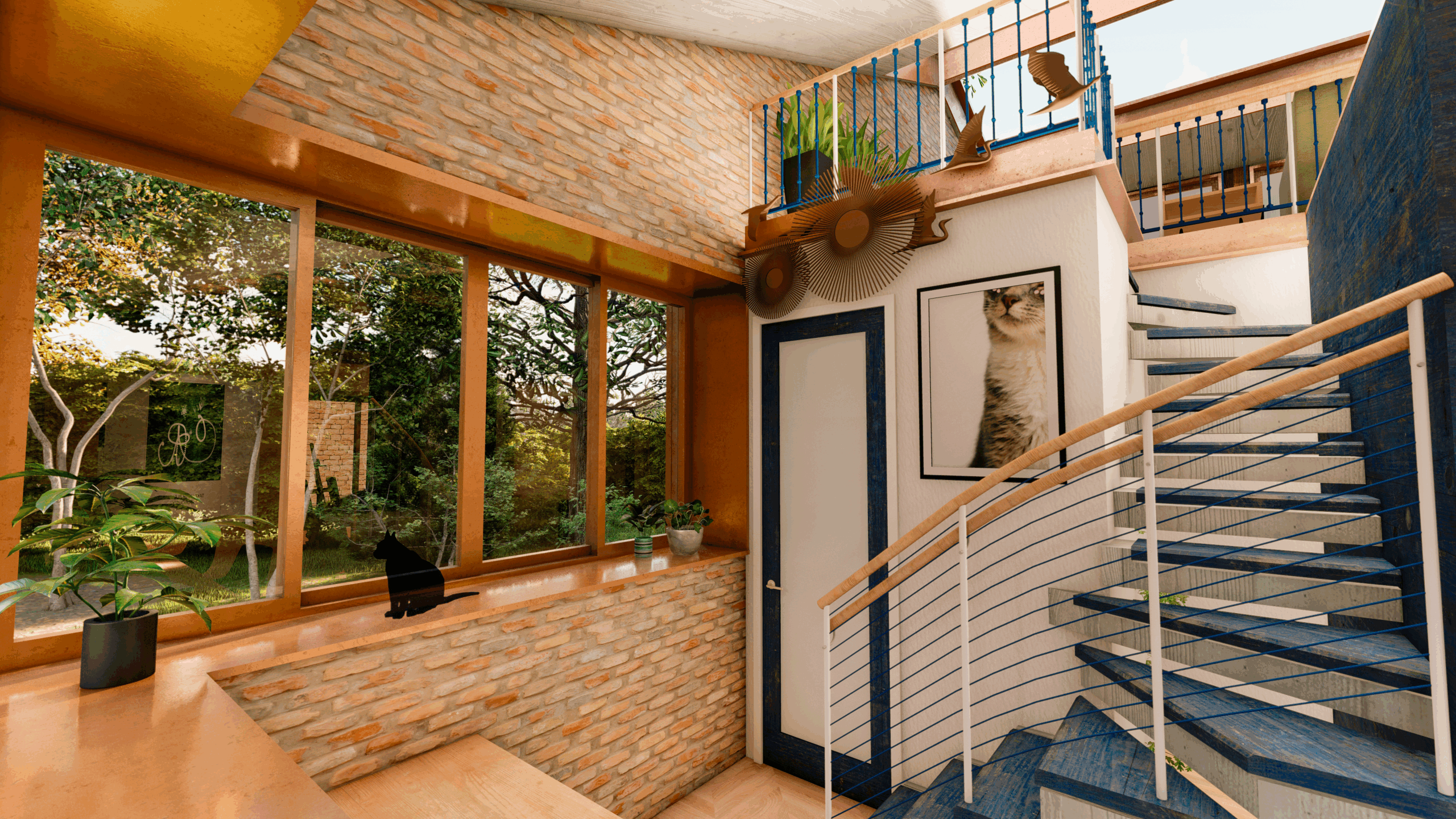 Aquest volum, també d’una alçada considerable, permet ubicar 2 dormitoris i una cambra de bany en la part baixa i un pis superior al qual s’accedeix des d’una escala recta. La barana permet que des d’aquesta planta superior es vegi el passadís inferior, la terrassa exterior i el volum de la zona de dia: Junts, però separats…