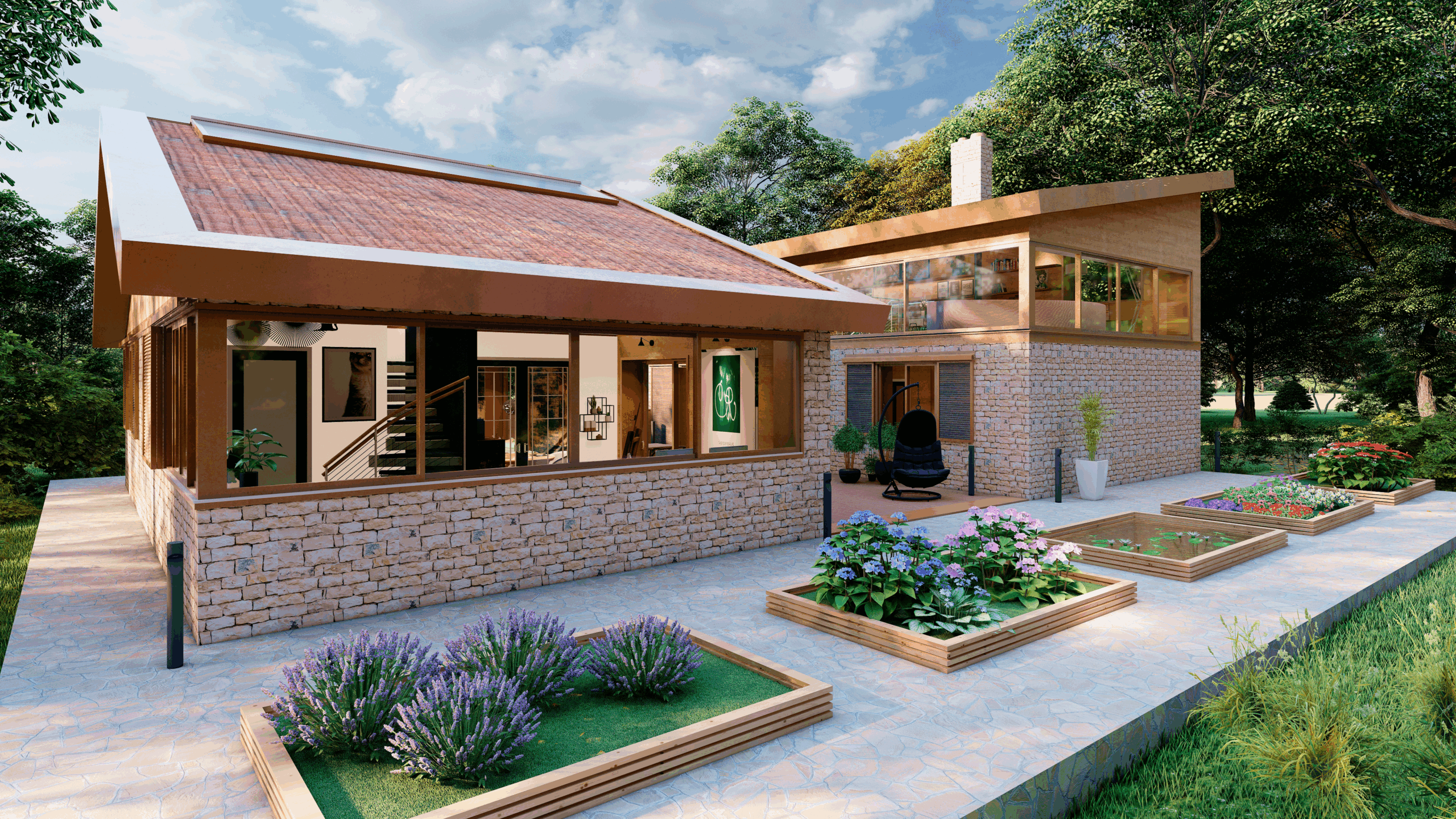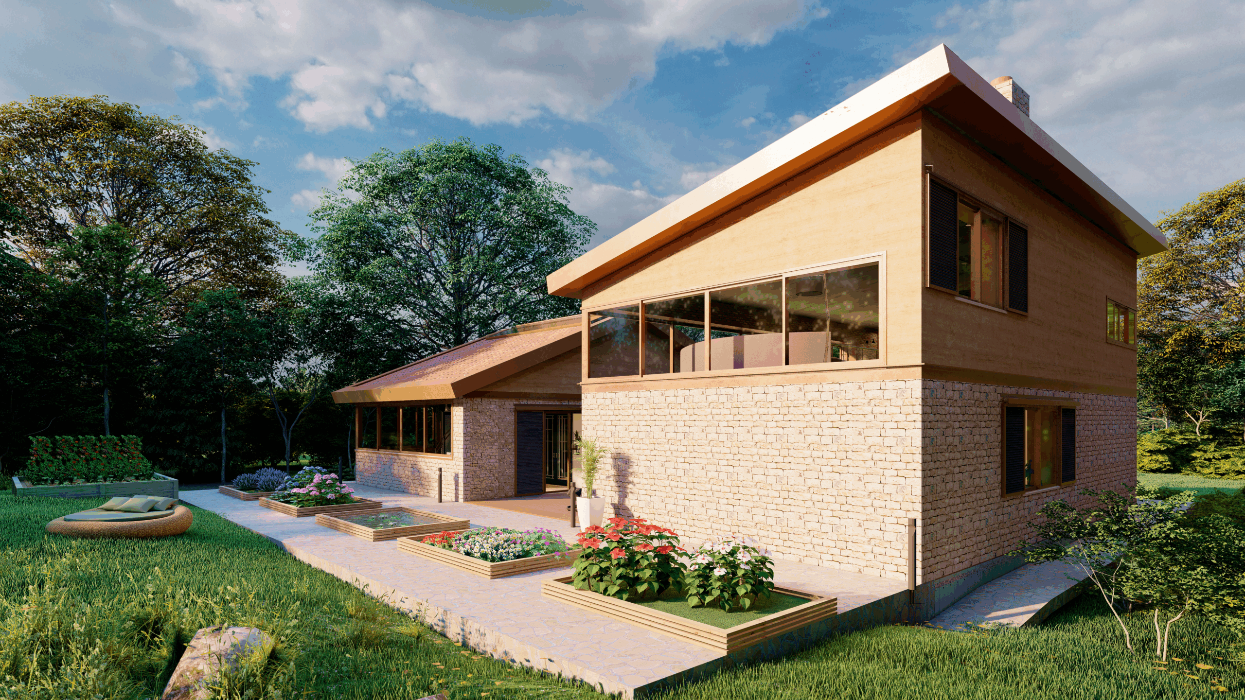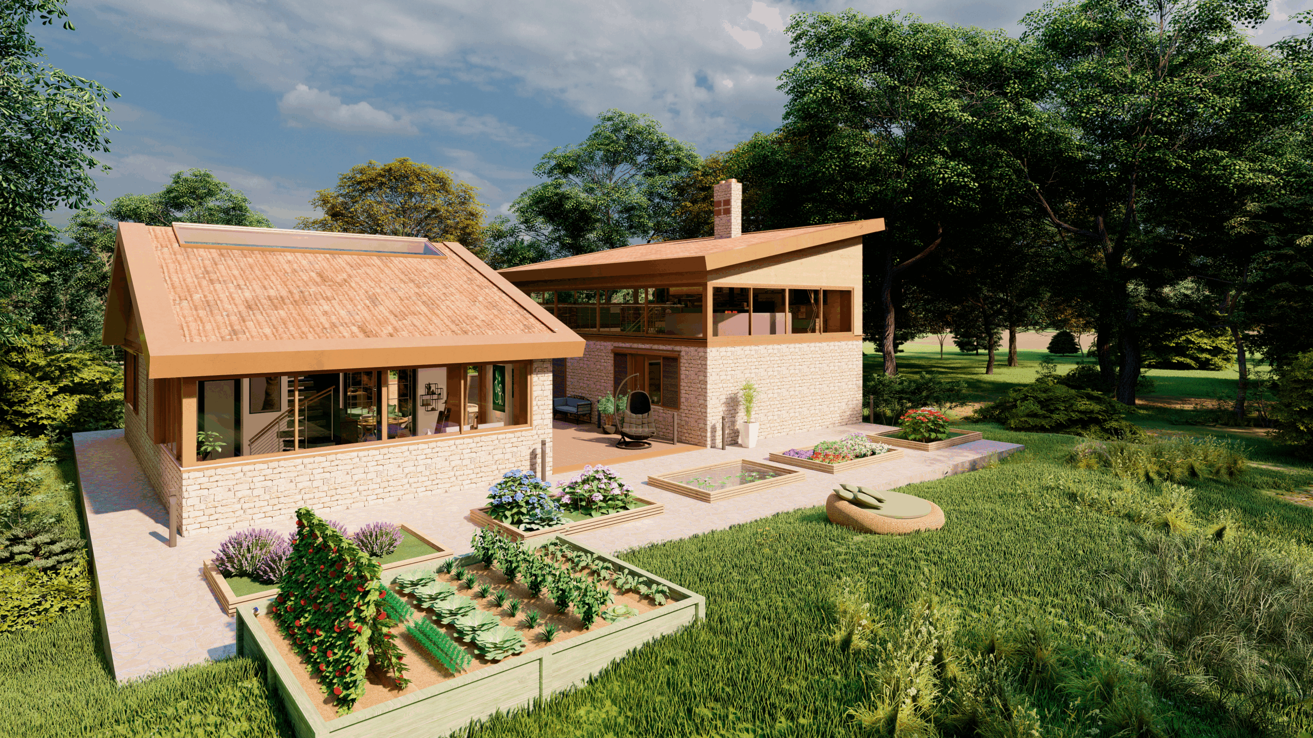 L’hort i la vida a l’exterior donen ritme a una intimitat donada pels 2 volums edificats.