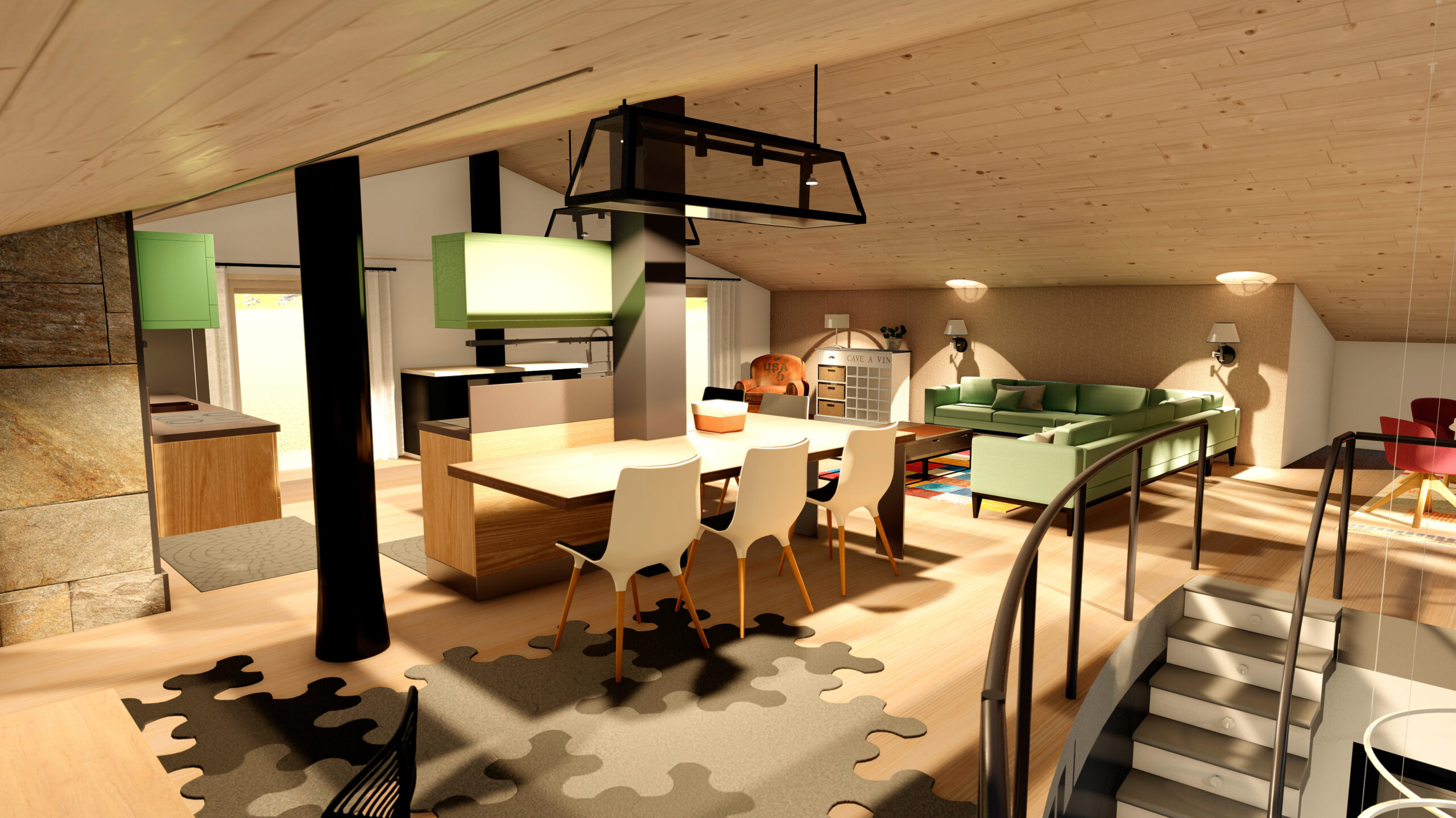 - En Pradrina 02, la Sala d’estar és l’element central, per aquest motiu la llar de foc. Dos escales porten es podria dir a Padrina 02-a i Padrina 02-b, ja que són ambients independents i que s’han tractat com a annexes.